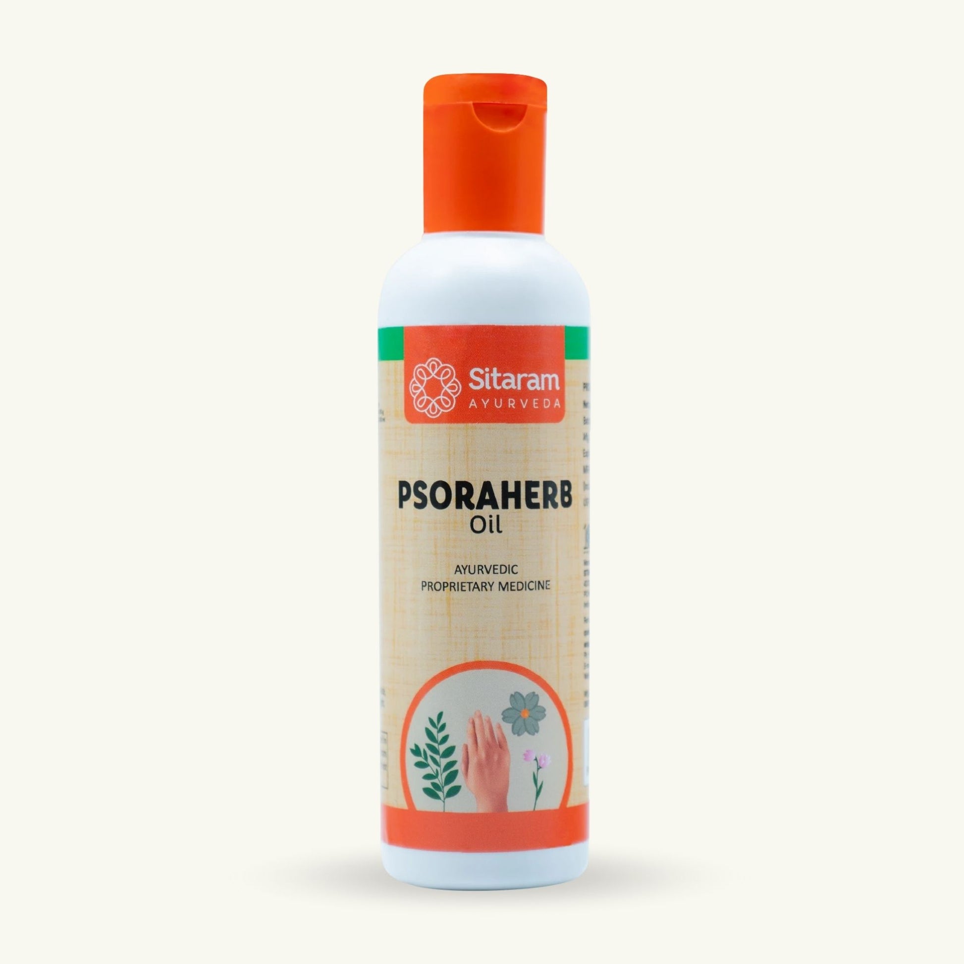 Psora Herb Oil is a classical Ayurvedic skin oil prepared with Danthapala / Śveta Kutaja (Wrightia tinctoria) infused in a coconut oil base by the traditional Aditya Paka process. Used externally as part of a gentle daily routine for dry, scaly and irritated-feeling skin.